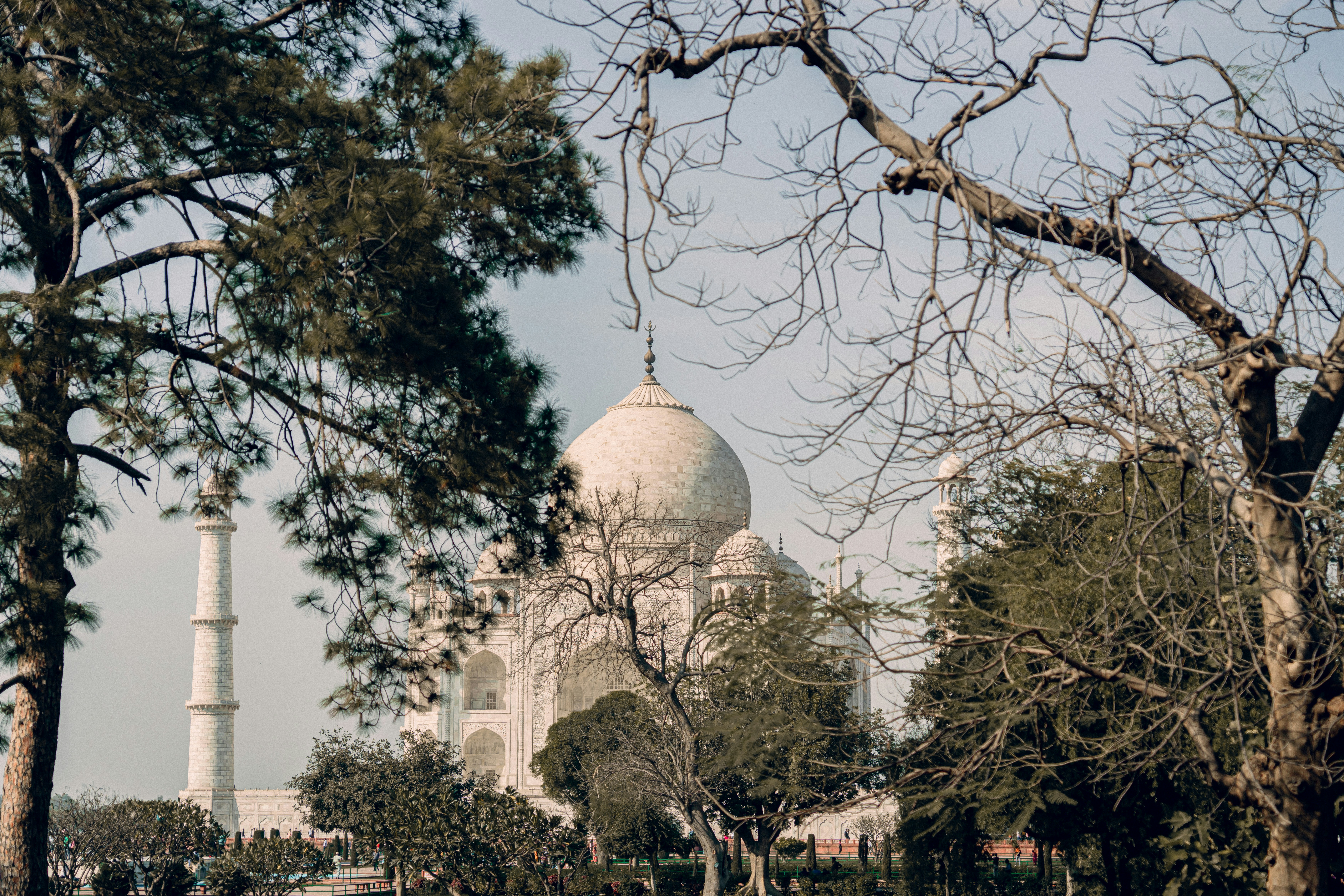 The Taj Mahal, situated in Agra, India, is a renowned white marble mausoleum constructed by Mughal Emperor Shah Jahan in memory of his wife, Mumtaz Mahal. This architectural masterpiece exemplifies Mughal design and craftsmanship, featuring intricate carvings, precise inlay work, and a symmetrical layout. The structure stands as both a testament to love and a pinnacle of Mughal architectural achievement.